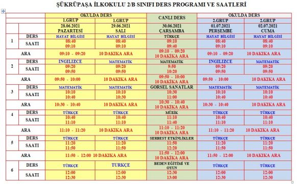 2023-2024 1. sınıf Ders ve Süre Tabloları